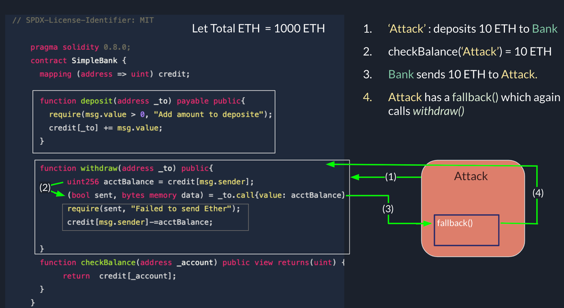 withdraw()transaction to contract bank. - Since the balance has not been yet set to 0, the user can again withdraw 10 ETH