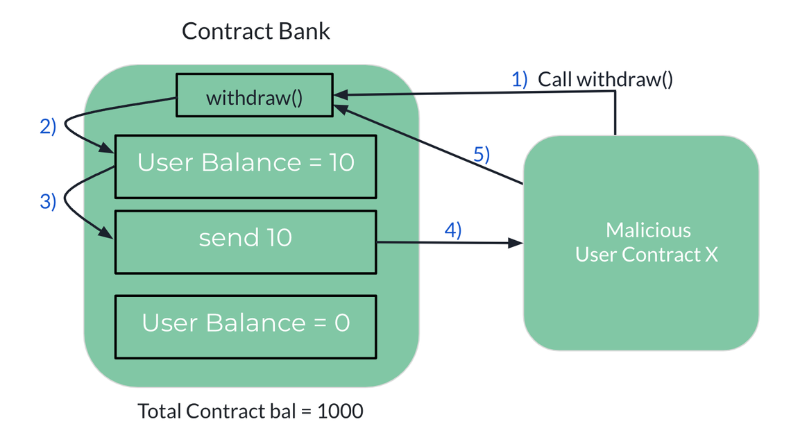 - Thus, the Contract X recursively reenters and withdraw funds until the contract bank is drained.
